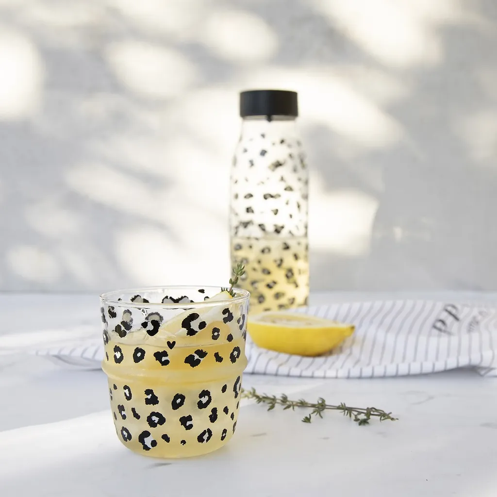 Lieferumfang: 2 Wasserflaschen/Karaffen Maße: Höhe 26 cm, Durchmesser 8,5 cm; Füllmenge 1000ml Farbe: transparent mit schwarzem Motiv Material: Glas spülmaschinenfest & mikrowellengeeignet Dieses Produkt ist ein Unikat – kleine Unregelemäßigkeiten in Form und Farbe können durch die individuelle Produktion auftreten