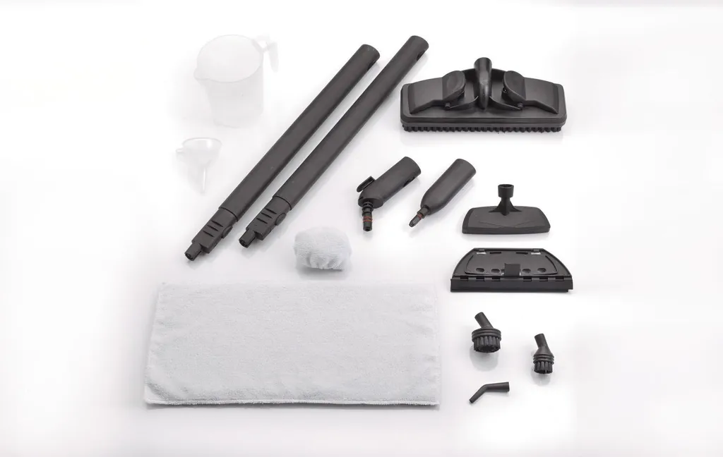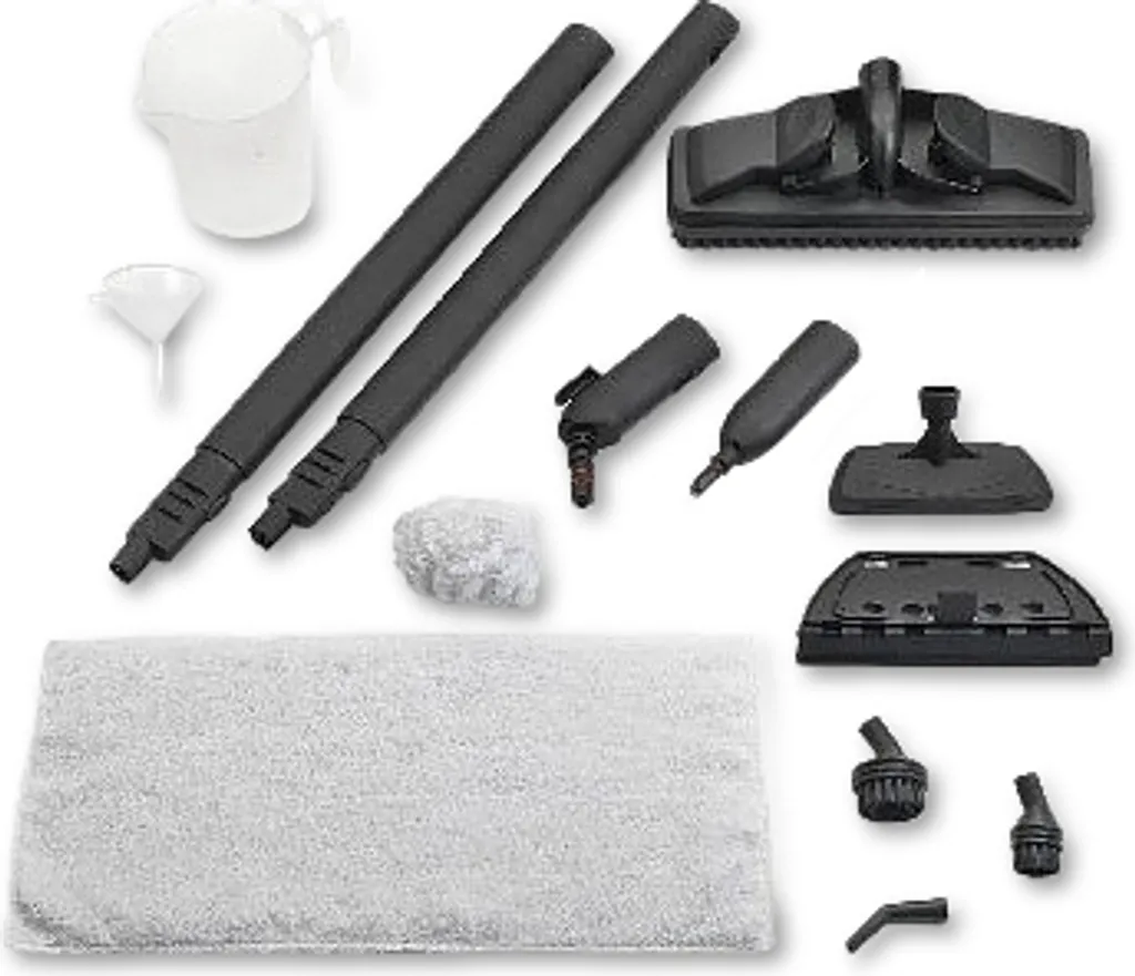 - Accessori: tubi prolunga, spazzola, accessorio lavavetri, spazzolino rotondo grande e piccolo, imbuto, misurino, beccuccio 90°, spazzola tessuti con panno cuffia, panno in microfibra per pavimenti