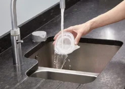 - Schmutzfangbehälter: Lässt sich auf Knopfdruck einfach entfernen und ist spülmaschinenfest.