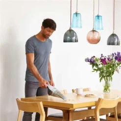 Die Akkutechnologie ermöglicht ein einfaches ‚In die Hand nehmen und lossaugen‘. Der Schmutzfangbehälter lässt sich auf Knopfdruck einfach entfernen und ist spülmaschinenfest, die Saugöffnung hat eine breite Saugnase, die mühelos auch gröberen Schmutz wie Tierfutter oder Müsli aufsaugt. Hygienische Filtertechnik mit austausch- und waschbarem Filter. Lithium-Ionen Akku, Laufzeit: 10 Minuten, Ladezeit: 10 Stunden, mit Ladestandsanzeige, 7,2 Volt, 10,8 Wh, Luftdurchsatz: 882 l/min, Saugleistung: 350 mm/Wassersäule, Staubfangbehälter: 385 ml. Gerätegewicht: 0.681 kg. Eurostecker CEE 7/16. Lieferumfang: Ladestation, Wandaufhängung, ausziehbare Fugendüse