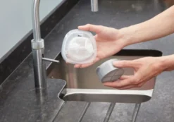 - Schmutzfangbehälter: Lässt sich auf Knopfdruck einfach entfernen und ist spülmaschinenfest.