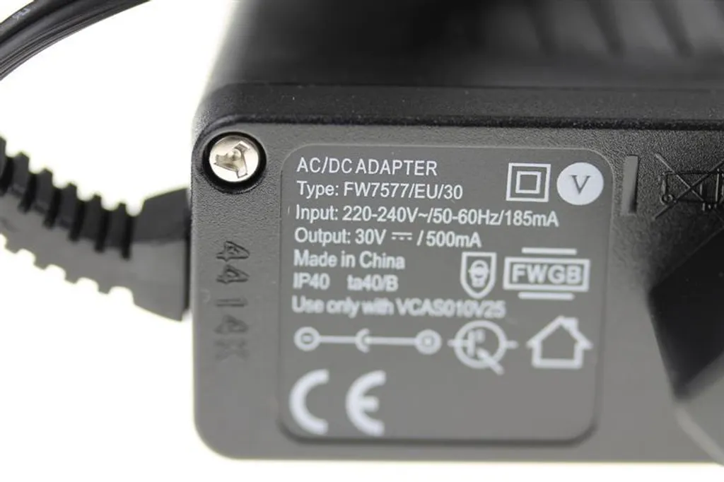 - AC/DC ADAPTER Type: FW7577/EU/30 Input: 220-240V 50-60Hz 185 mA Output: 30V …/ 500mA IP40 ta40/B Use only with VCAS010V25