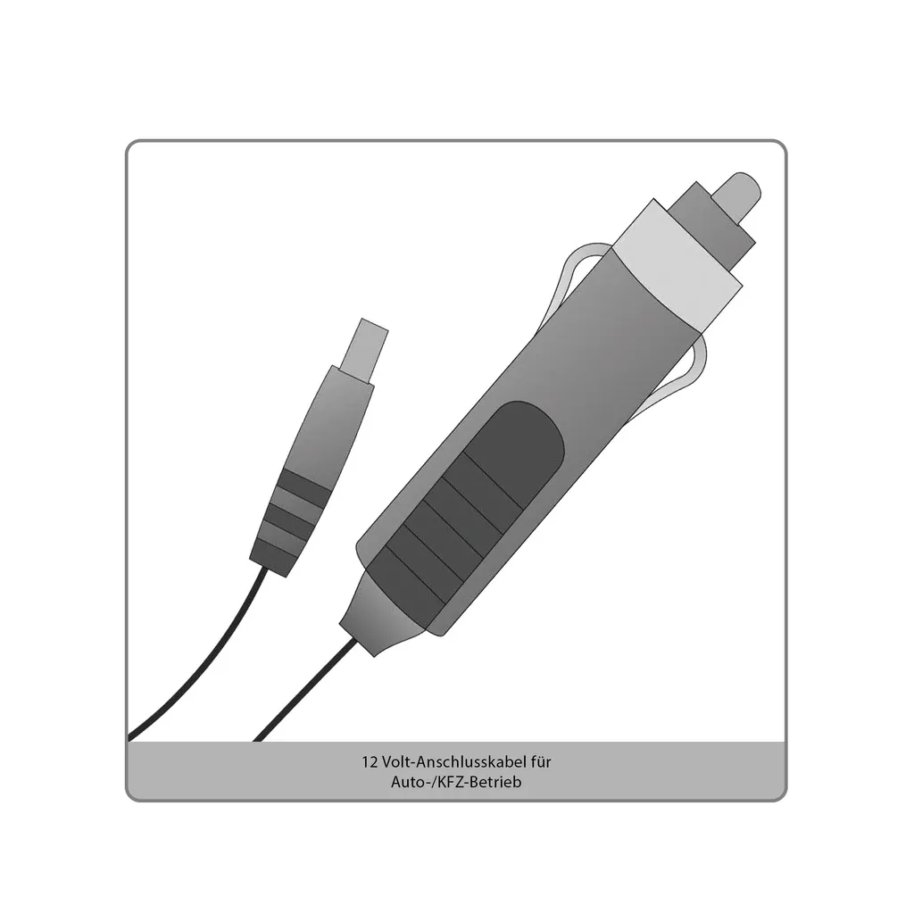 - Zubehör: 12 Volt-Anschlusskabel für Auto-/KFZ-Betrieb