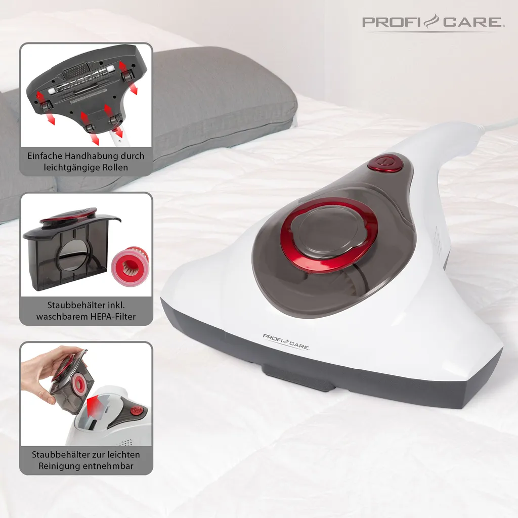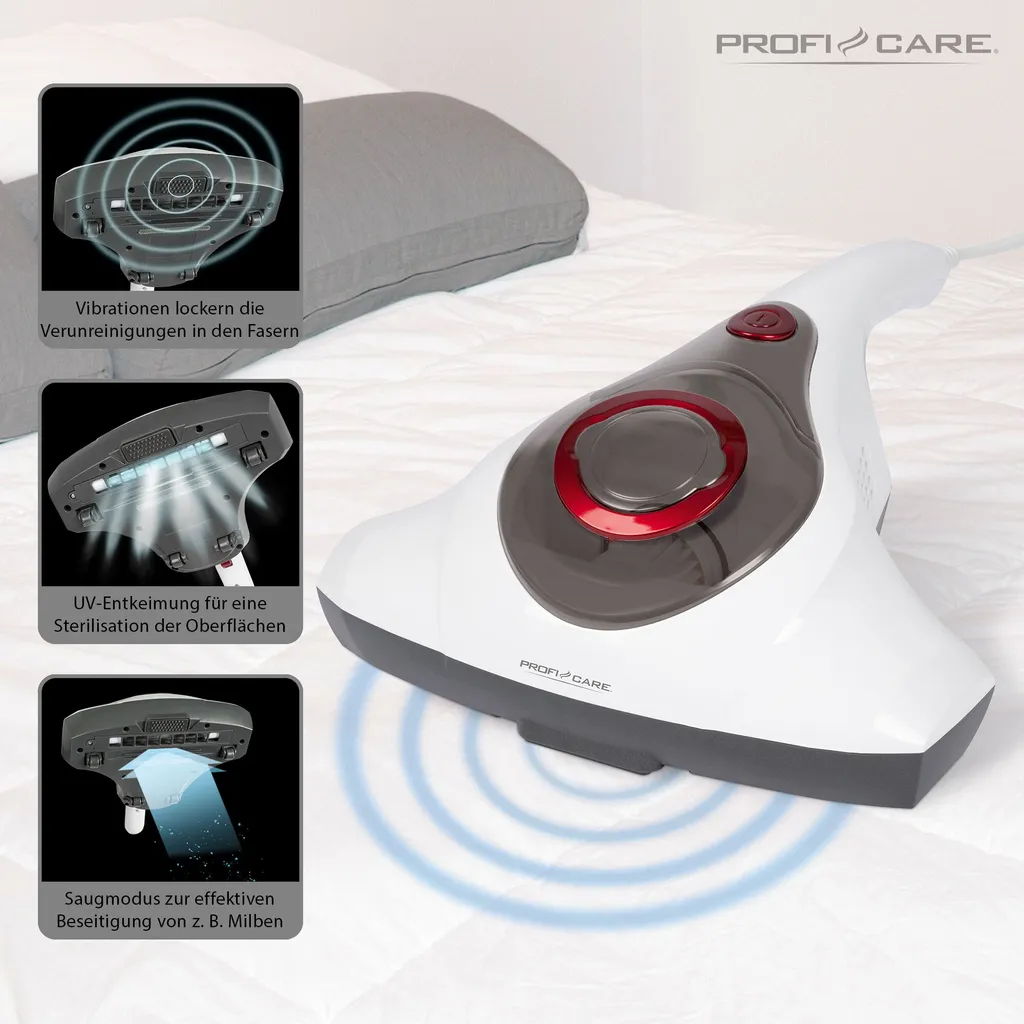 Reinigung & Sterilisation — Viele Menschen leiden unter einer Hausstauballergie. Schuld daran sind Milben, Bakterien, Viren und Pilze. Mit dem Milbensauger PC-MS 3079 von ProfiCare sagen Sie diesen den Kampf an. Ganz ohne Chemie befreien Sie Ihr Bett, Kopfkissen, Polstermöbel und weitere Textilien von Staub und Verunreinigungen und gleichzeitig sterilisieren Sie die Oberfläche dank intergrierter UV-Lampe.