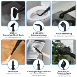 Unser hocheffizientes Gerät ist ideal zum Reinigen von verschiedensten Oberflächen. Nach einer Aufheizzeit für 4 Minuten stößt es 8-10 Minuten lang heißen Dampf aus. Mit ihm erfolgt die Reinigung ohne jegliche Chemikalien. Zudem ist das Gerät mit einem Überhitzungsschutz ausgestattet. Durch das umfassenden Zubehör lassen sich mit dem Dampfreiniger Küchen, Böden, Teppiche, Sofas und Fenster reinigen. Außerdem kann er auch draußen genutzt werden. Zögern Sie also nicht länger und schlagen Sie zu!