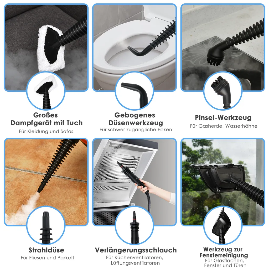Dieser multifunktionale Dampfreiniger kann für Küchen, Autoreifen, Sofas, Böden, Fenster usw. genutzt werden. Er kann sogar zum Bügeln von Kleidung verwendet werden, und ist daher sehr praktisch.