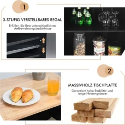 Dieser Rollwagen verfügt über ein modernes, schlichtes Design und eine Tischplatte mit natürlicher Holzmaserung, die perfekt zu jedem Einrichtungsstil passt. Inzwischen kann diese praktische Kücheninsel mit Stauraum auch als Kaffeebar, Konsolentisch oder Serviertisch im Wohnzimmer, Esszimmer, Restaurant usw. verwendet werden.