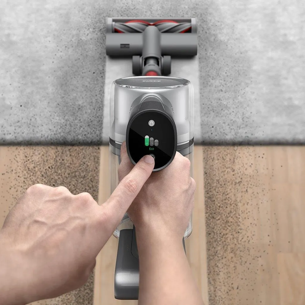 Sind Sie es leid, beim Staub saugen ständig die Taste gedrückt zu halten? Dreame hat das neue Modell mit einem LCD-Farbbildschirm ausgestattet, auf dem für bequeme Reinigung die Tastensperre mit einmal Antippen aktiviert werden kann. Auf dem Display werden außerdem der Akkuladestand und Hinweise zur Filterreinigung angezeigt und den Reinigungsmodus können Sie hier mühelos mit einem einzigen Antippen ändern.