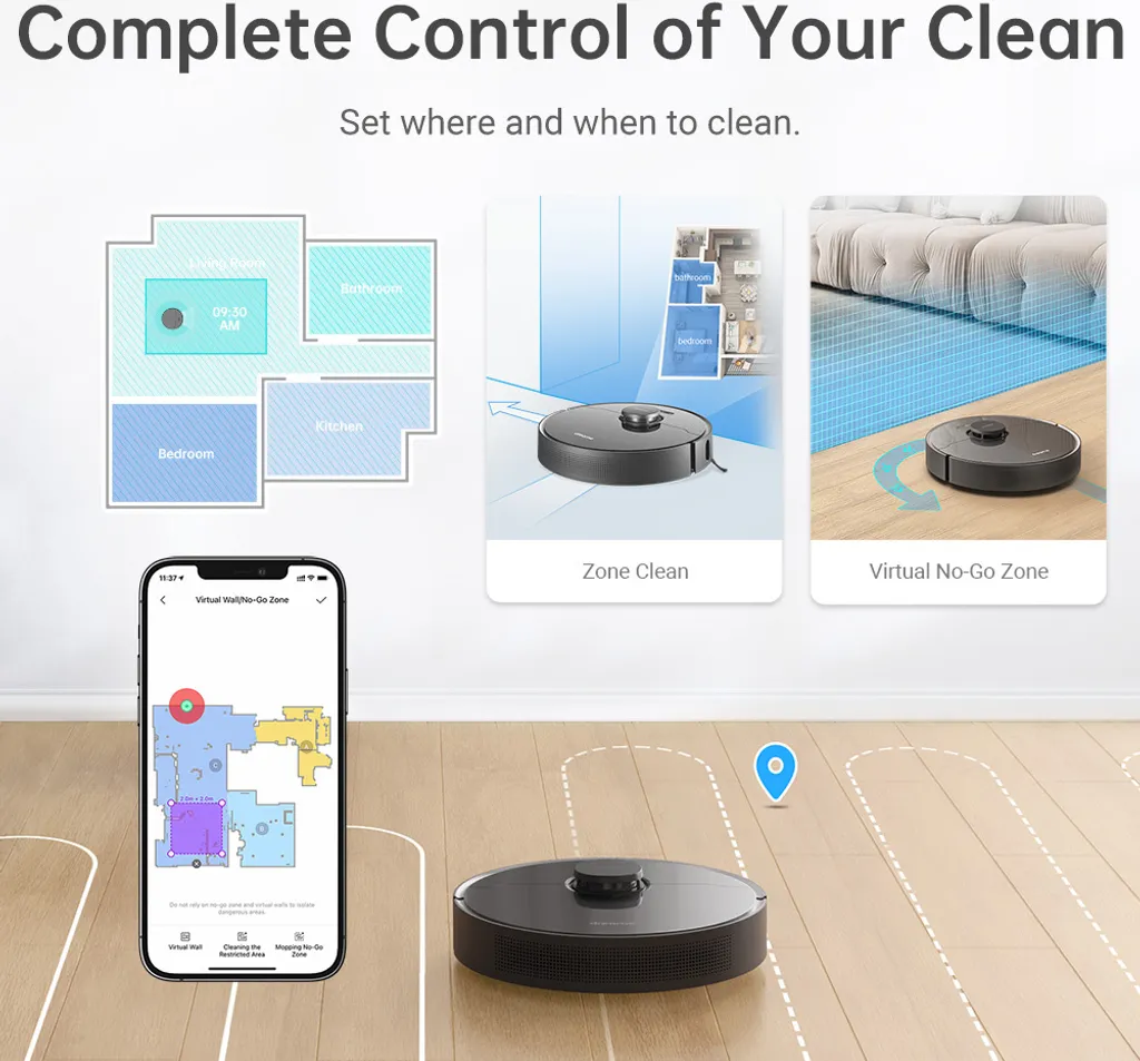 【No-go-Zone, unsichtbare Wand und No-mop Zone】: Steuern Sie genau, wo und wann sich Ihr Roboter mit virtuellen Hindernissen bewegt.