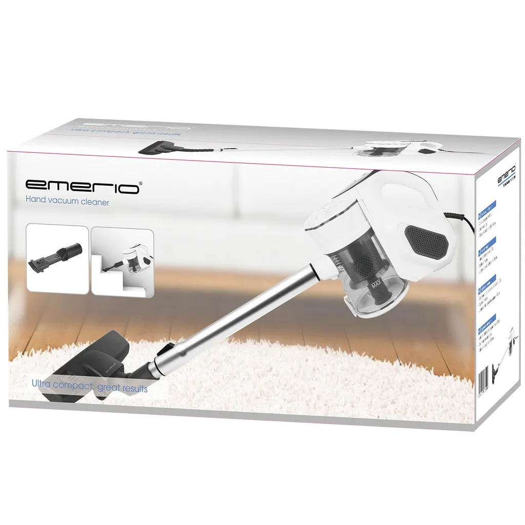 Beutelloser Handstaubsauger mit Zyklon-Technologie von Emerio. Er verfügt über eine so starke Saugkraft wie mit einem 1000 Watt-Gerät. Die Kabellänge von 5 m ermöglicht einen Aktionsradius von bis zu 6 Meter. Mit Hepa-Filter und leicht zu entleerendem Staub-Auffangbehälter (Kapazität 0,5 Liter). Inkl. Metall-Saugrohr, umschaltbarer Bodendüse und Möbelpinsel mit Fugen-Düse. Leistung 600 Watt. Maße LxBXH ca.: 15,5 x 25 x 113 cm.