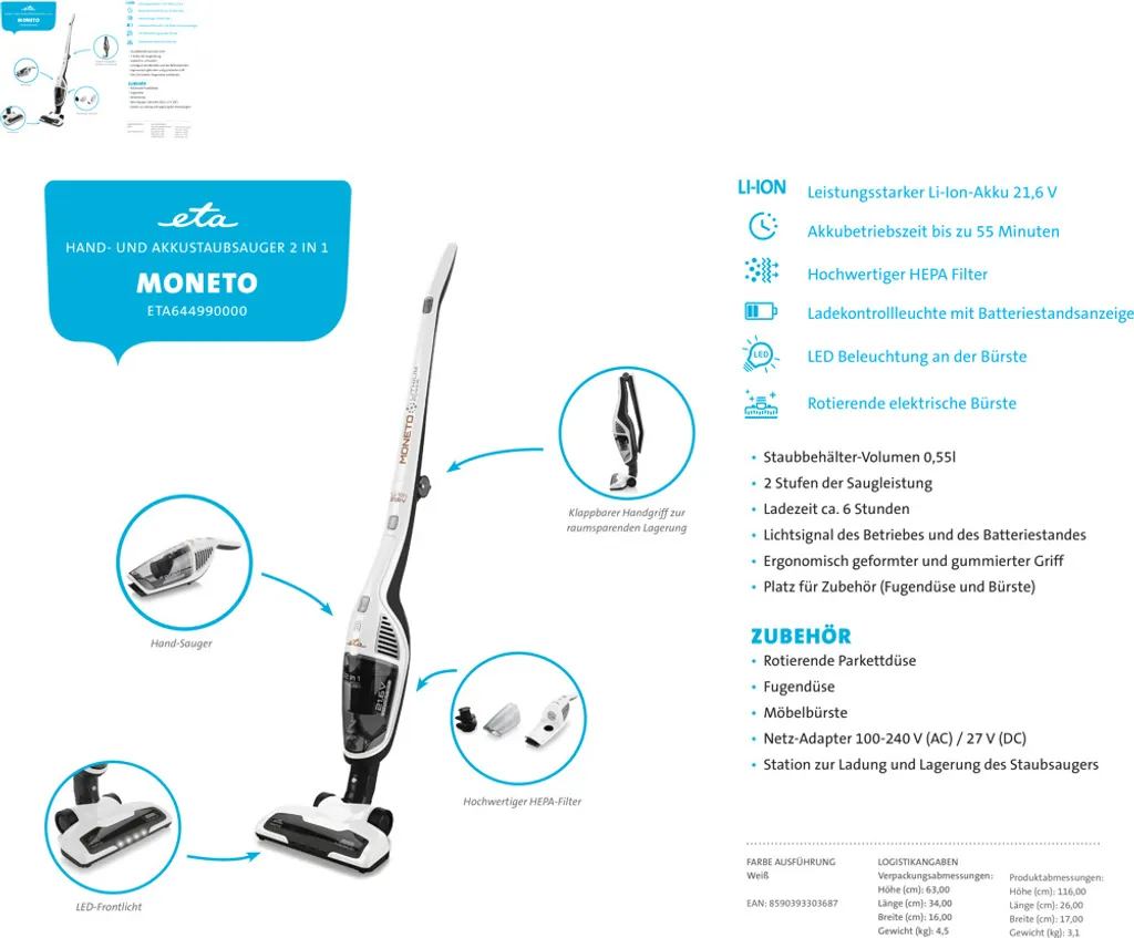 Der ETA Moneto passt in jedes Haus. Er hat ein modernes und elegantes Design, ist einfach zu bedienen und leicht zu warten. Dank des ergonomischen Griffes, ist der Staubsauger bequem zu handhaben und kann bei Bedarf zusammengeklappt und im Schrank verstaut werden.