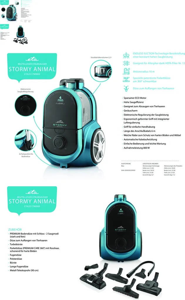 Zusammen mit dem ETA Stormy Animal Staubsauger erhalten Sie:
