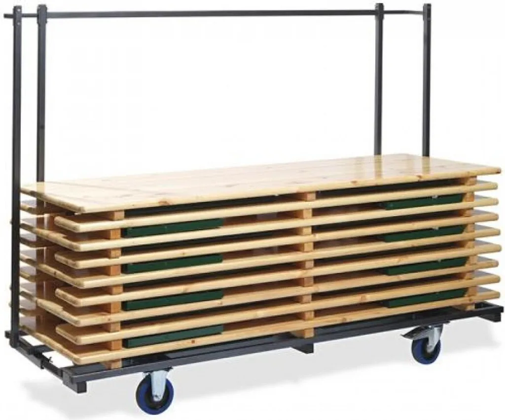 Der Transportwagen für Bierzeltgarnituren ist ausziehbar und eignet sich daher für alle Größen von Bierzeltgarnituren. Es können insgesamt 10 komplette Garnituren transportiert werden. Zudem ist es auch möglich, separat 20 Tische oder 40 Bänke zu transportieren. Der Wagen verfügt über 2 Bock- und Lenkrollen mit Feststeller zu 160 mm mit Kugellagern der Marke Torwegge.
