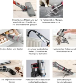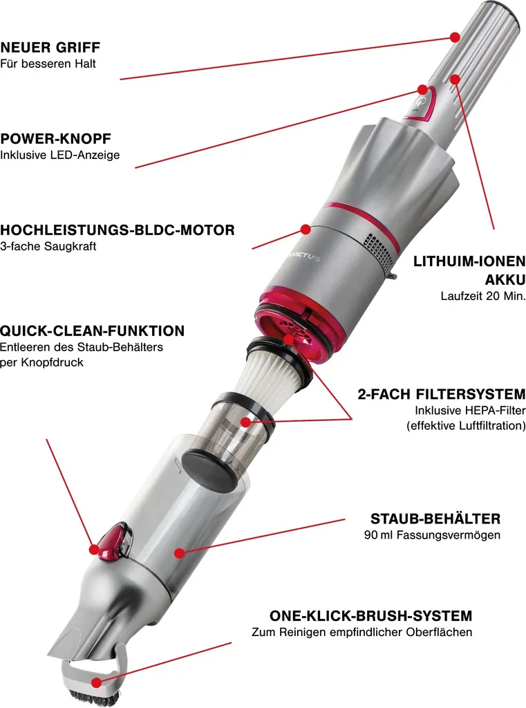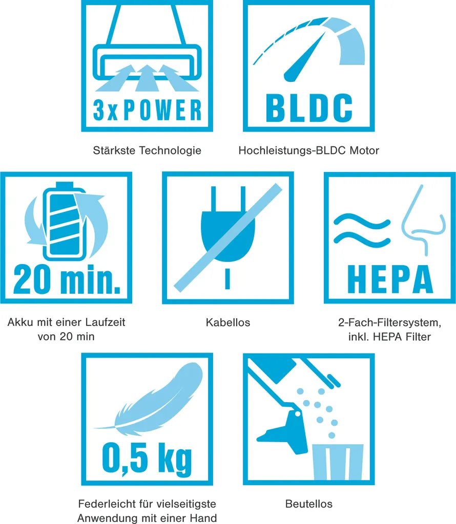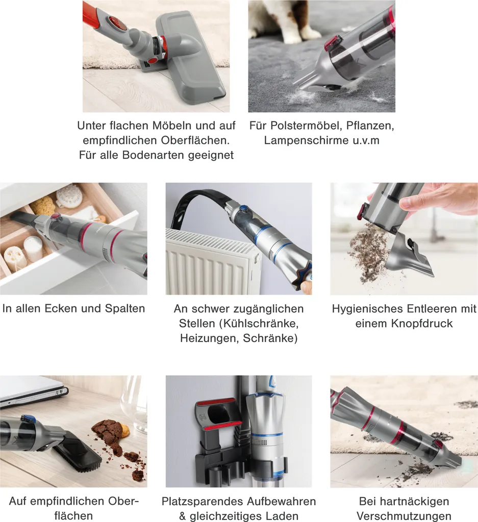 Mit 3-facher Saugkraft, bietet der kabellose Handstaubsauger eine noch gründlichere Reinigung und erweitert nochmals die möglichen Einsatzgebiete. In Kombination mit einer verlängerten Akkulaufzeit von bis zu 20 Minuten können alle gewünschten Oberflächen, Möbel, Polster, Nischen, Ecken und Zwischenräume mühelos tiefengereinigt werden!