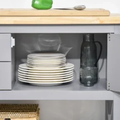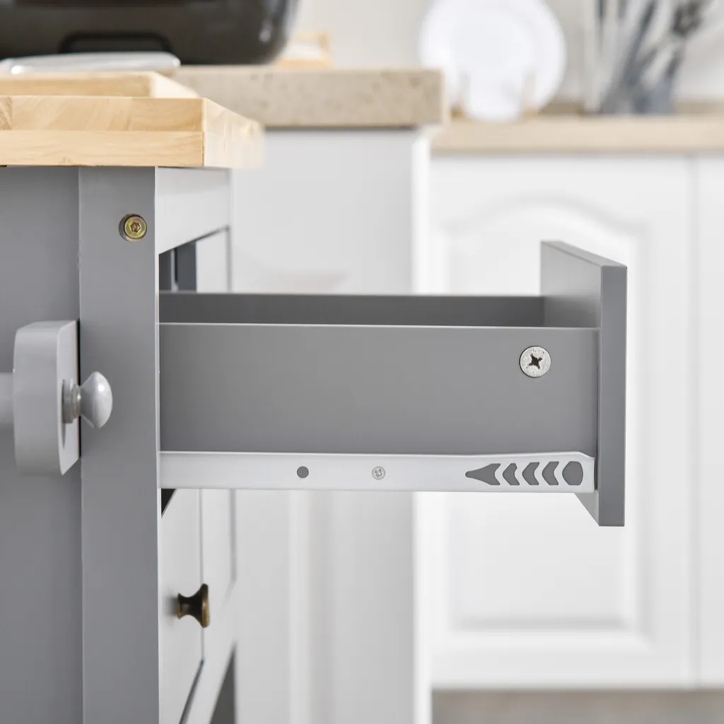 Die Tischplatte aus massivem Gummiholz ist 3 cm dick. Das Küchenwagen ist mit MDF-Platten und glatter Oberfläche leicht abwischbar, wenn es Verschüttungen oder Verschmutzungen gibt.
