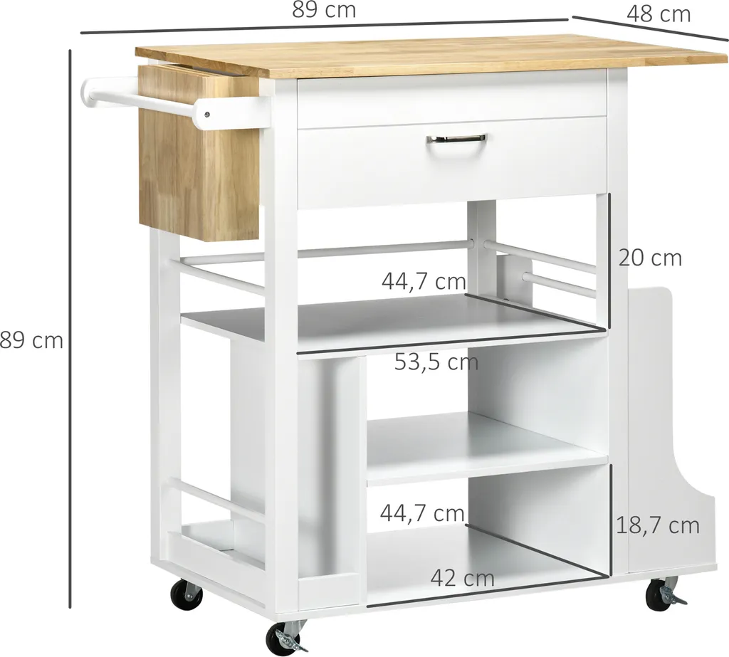 Gesamtmaße: 89B x 48T x 89H cm. Tragkraft: 50 kg (insgesamt), 15 kg (Platte), 5 kg (Regal/Gewürzregal), 3 kg (Schublade), 2 kg (Handtuchhalter/Messerhalter). Montage erforderlich.