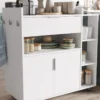 4 offene Stahlregale können zur Aufbewahrung von Küchenutensilien verwendet werden. Sie können auch zur einmaligen Verwendung entfernt werden. 2 zusätzliche Körbe auf jeder Seite bieten geeigneten Platz für Soßen, Essig, Zucker, Lappen usw. Die große Tischplatte aus Holz ist stabil genug für große Gegenstände