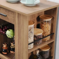 Ein Küchenwagen mit zahlreichen Regalen ist ideal für die Aufbewahrung von Behältern mit großer Lebendigkeit sowie Obst und Gemüse, Wein, Säften oder Gewürzen. Ein solcher Küchenhelfer mit einem Ofen wurde entwickelt, um den Zugang zu den darauf gelagerten Gegenständen und die Zonierung kleiner Räume zu erleichtern. Der Wagen funktioniert als Lagerregal oder Servierwagen.
