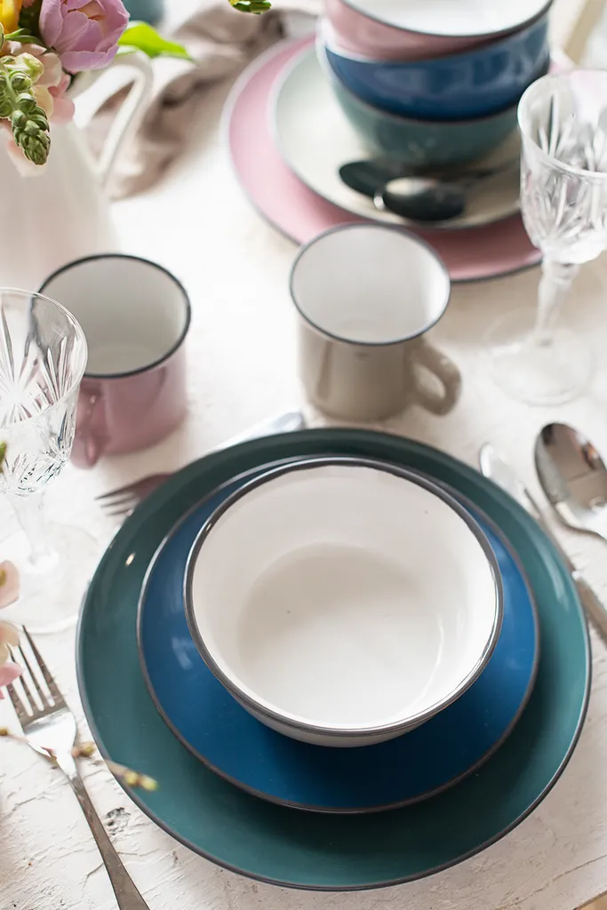 Herbstliche frische Farben und originelle, an traditionelles Emaille-Geschirr angelehnte Formen sorgen für gute Laune, der dunkel abgesetzte Rand zugleich für klare Linien. Je nach Stimmung und Bedarf kombinieren Sie mit Maila die vier sorgfältig aufeinander abgestimmten verfügbaren Farben altrosa, dunkelblau, petrol und beige zu einem harmonischen Ensemble.