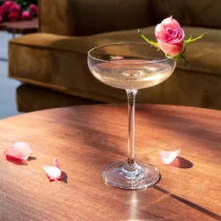 INTERESSANTES DESIGN – Ein flacher, breiter Glaskelch wird nicht nur im klassischen Interieur gut aussehen. Der hohe Stiel auf einem stabilen Boden verhindert das Erhitzen des Getränks.