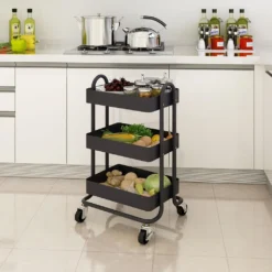 Der praktische Rollwagen ist vielseitig einsetzbar und kann in der Küche, im Badezimmer und vielen weiteren Räumen verwendet werden. Durch die vier Rollen lässt er sich schnell und einfach verschieben. Die drei Ablagekörbe sorgen für eine sortierte Aufbewahrung und eignen sich für sämtliche Gegenstände.