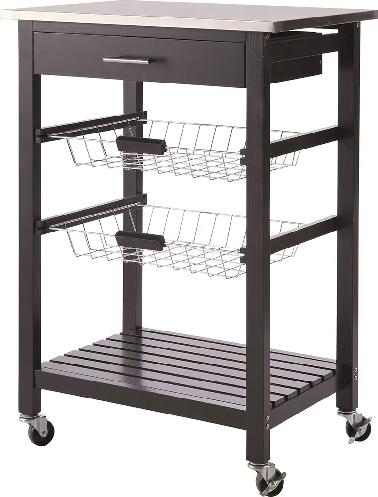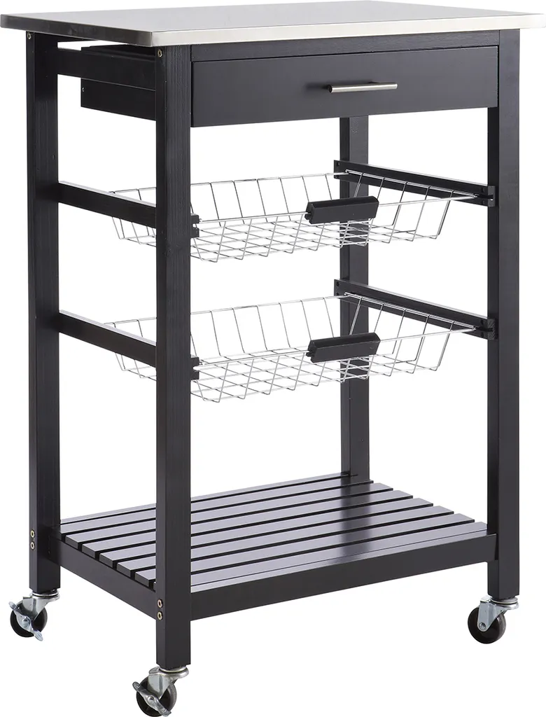 In 2 Metallkörbe und 1 Schubkastens bietet er genügend Stauraum um alle notwendigen Sachen, aus Küche oder Esszimmer, sicher und ordentlich zu verstauen. Zudem verfügt „Columbia I“ über eine Deckplatte aus Edelstahl, die sich optimal für die Zubereitung von Speisen eignet. Dank der 4 hochwertigen Rollen lässt sich der Küchenwagen spielend leicht von A nach B bewegen.