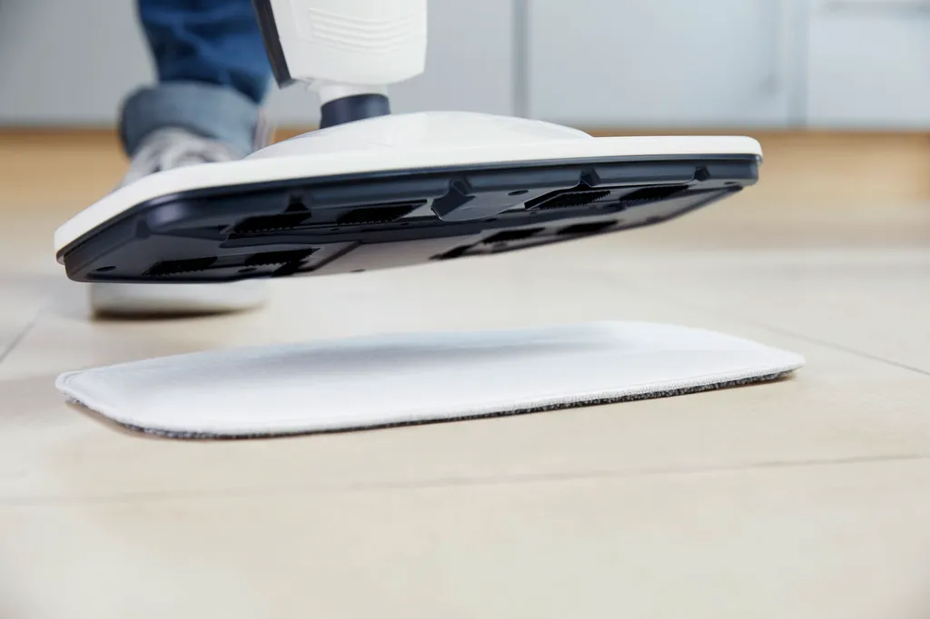 Und so einfach funktioniert es: Der Dampfreiniger benötigt weniger als 30 Sekunden zum Aufheizen und ist dann direkt einsatzbereit. Ist das Wasser heiß, verteilen sechs Düsen den Wasserdampf gleichmäßig im Wischpad. Dabei lässt sich über die stufenlose Regulierung die Dampfmenge optimal auf den Boden abstimmen. Die geringste Stufe eignet sich für versiegelte Holzböden wie Parkett und Laminat, die höchste Stufe reinigt gründlich Fliesen- und Steinböden. Den gelösten Schmutz nimmt das austauschbare Mikrofaser-Wischpad auf, sodass alles hygienisch und zugleich gründlich sauber wird. Dank dem praktischen Teppichgleiter eignet sich der Dampfreiniger auch zum Auffrischen von Teppichböden.