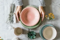 - ‚Dieses moderne, rustikal anmutende Geschirr-Service besteht aus 4 flachen Speisetellern in Rauchblau, 4 Desserttellern in Olivgrün, 4 Kaffeebechern (390 ml) in Koralle sowie 4 Mehrzweckschalen (für Müsli, Suppe, u.v.m.) in Türkis.