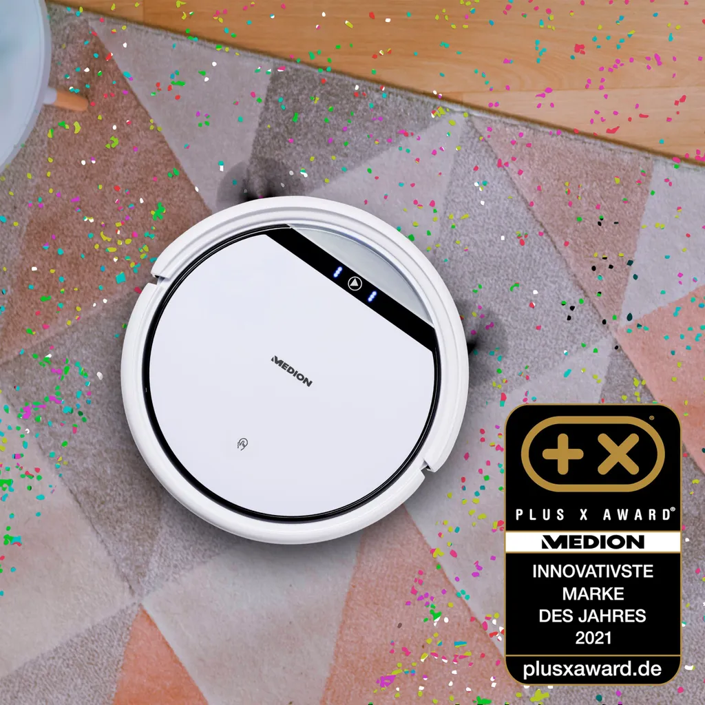 Mit dem MEDION Saugroboter E32 wird die Bodenreinigung für Sie zum Kinderspiel. Der starke Putzteufel ist durch seine speziellen Seitenbürsten perfekt geeignet, um Staub, Haare, Pollen oder Schmutz wirklich überall zuverlässig zu entfernen und Ihnen einen wesentlichen Teil der Hausarbeit komplett abzunehmen. Mit Hilfe moderner Sensoren fährt der MEDION E32 nämlich komplett selbstständig und auf kurzflorigen Teppichen ebenso sicher wie auf Fliesen oder Parkett. Das Beste daran: Durch die flexible Startmöglichkeit inklusive individuell planbarer Zeitpläne geht der Saugroboter auch dann seiner Arbeit nach, wenn Sie gar nicht zu Hause sind oder einfach die angenehmen Seiten des Lebens genießen.