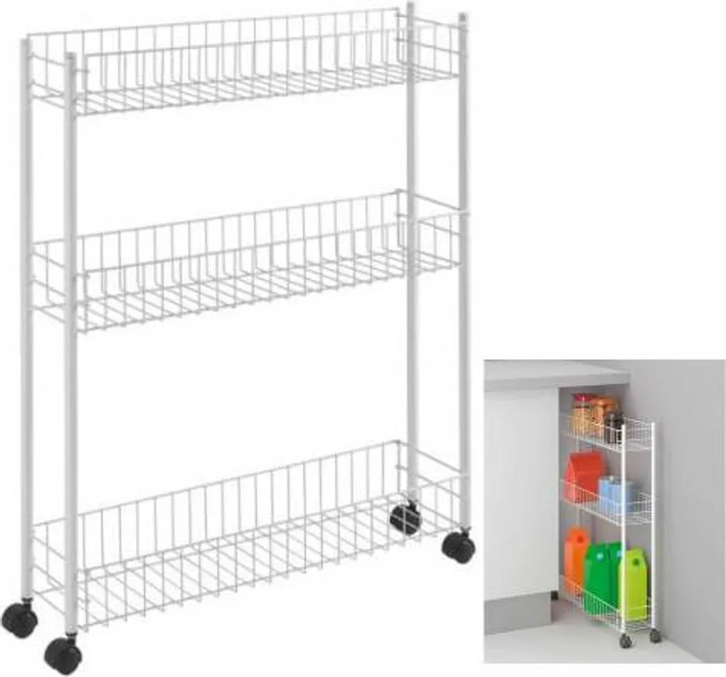 Dieses multifunktionale Lagerregal hat drei Ebenen und ist dank der Räder leicht zu bewegen. Diese extra schmale Version (16 cm) eignet sich perfekt für den Einsatz in kleinen Räumen. Sie können es ohne Schrauben oder Werkzeuge leicht selbst zusammenbauen