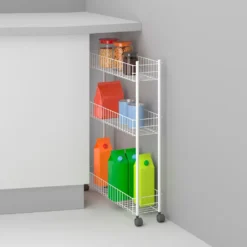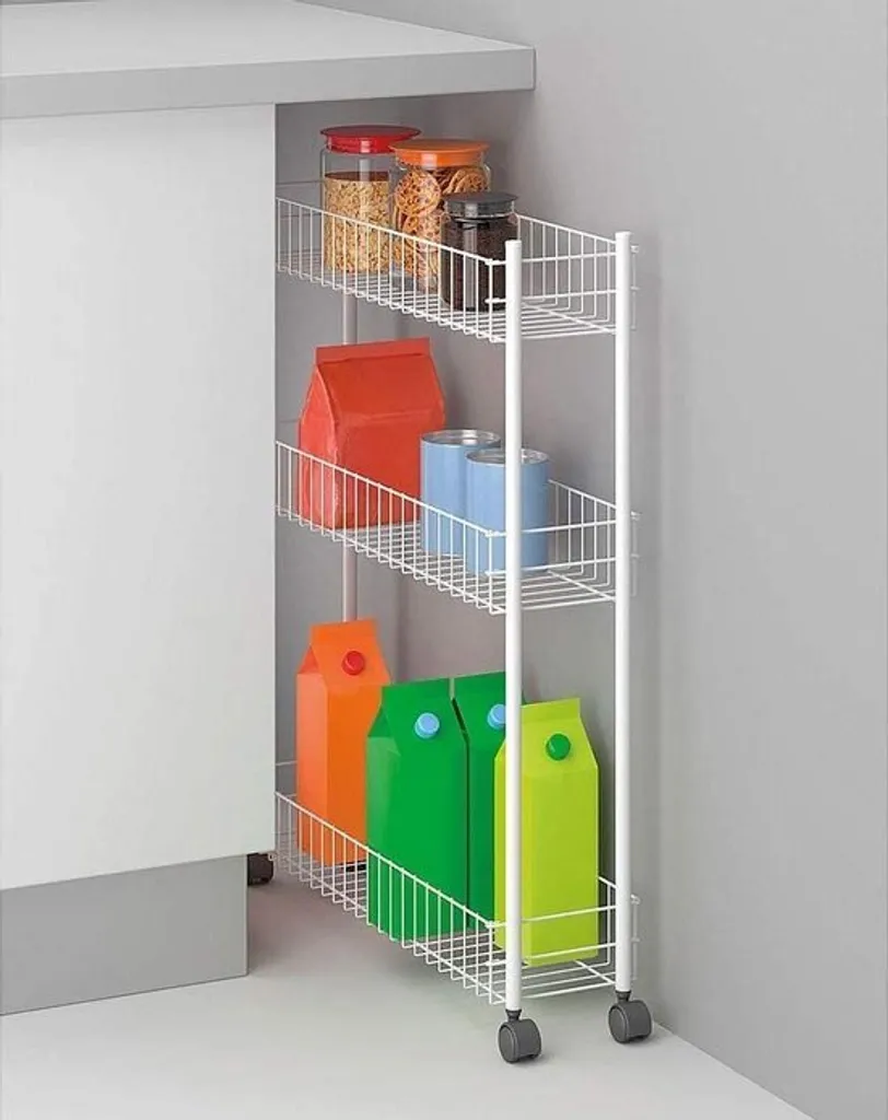 Dieser Rollwagen passt ideal in kleine Nischen. So können Sie den Stauraum, z. B. neben der Waschmaschine ausnutzen.