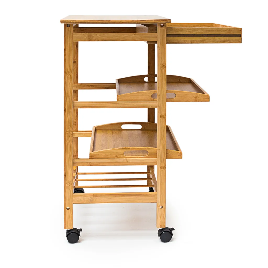 Die Servierwagen der JAMES Reihe bestechen durch ihre robuste Bauweise und das praktische Design. Mit diesen Helfern können Sie Geschirr, Flaschen, ganze Gerichte und vieles mehr bequem und unkompliziert transportieren. Auch als Beistelltisch sind die Rollwagen ideal geeignet. Der verwendete Bambus sieht dabei stets toll aus und ist zugleich äußerst robust.
