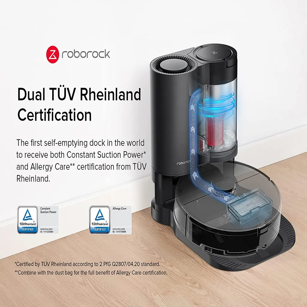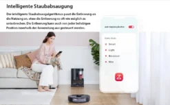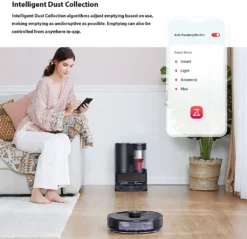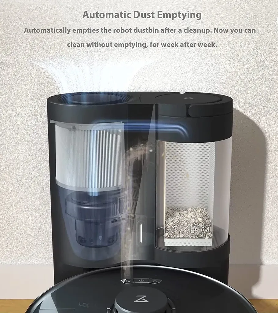 Automatische Staubentleerung: Leert den Roboter-Mülleimer nach einer Reinigung automatisch. Jetzt können Sie Woche für Woche ohne Entleeren reinigen. Ein 15-Zyklon-Design trennt Staub aus dem Luftstrom.