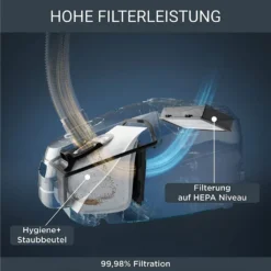 - HEPA-Filterung (mind. 99,98 %) hält bis zu 0,3 µm große Staubpartikel zurück, ideal für Allergiker