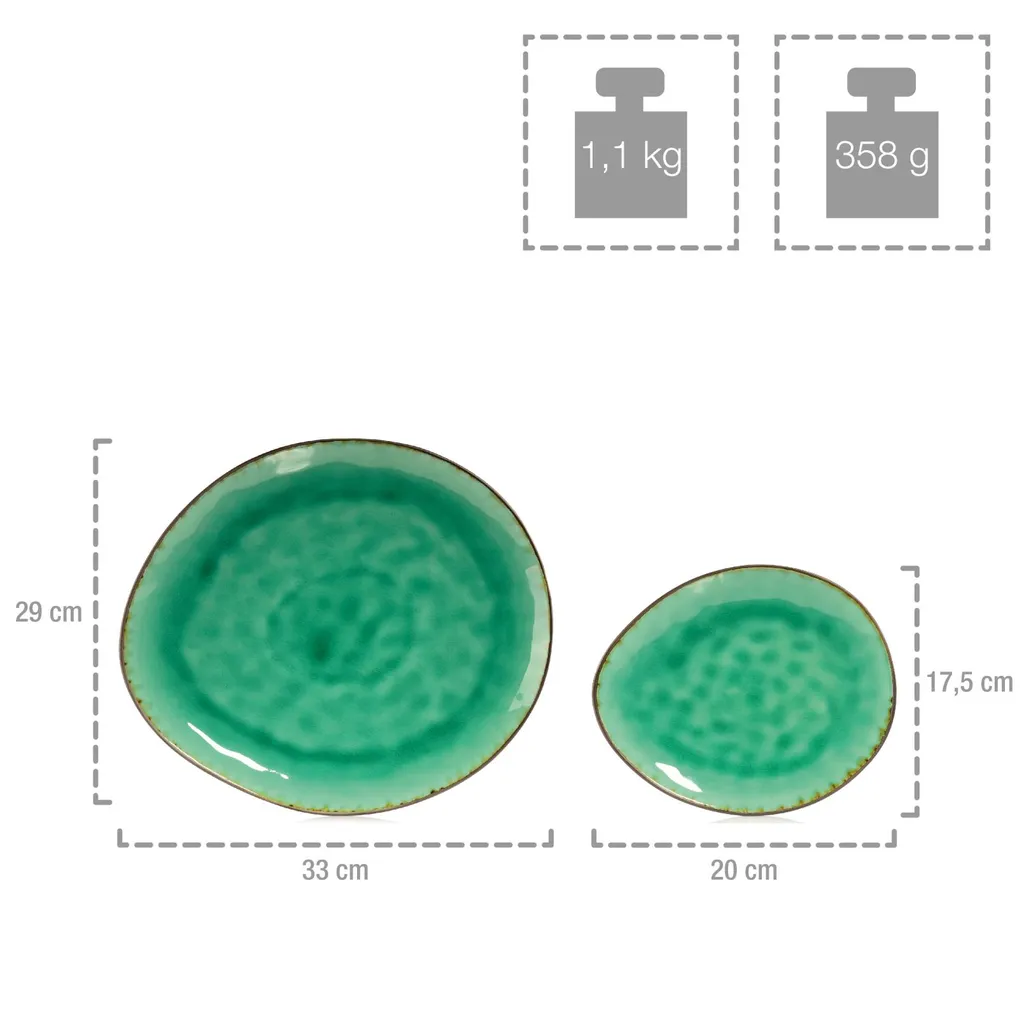 AUßERGEWÖHNLICHES DESIGN Durch die braunen Ränder sowie die türkisen und krakelierten Nutzflächen entsteht eine einzigartige Harmonie, welche einen unvergleichlichen Eindruck hinterlässt. Der Krakelee-Effekt, auch Reißlack genannt, zieht sich beim Trocknen zusammen, wobei sich ein Muster von Sprüngen bildet. Dieser Effekt gibt den Tellern eine ganz besondere tiefe und verleiht dem Tafelservice eine wundervolle Vintage Note