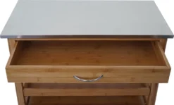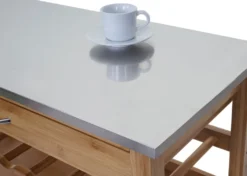 Dürfen wir vorstellen: Ihr neuer Allzweck-Küchenhelfer. Egal ob Sie ihn als zusätzlichem Lagerplatz für Ihre Lebensmittel, als Beistelltisch oder als Servierwagen verwenden wollen – alles kein Problem. Dank seiner Rollen kann er jederzeit bequem bewegt und an den hinteren Rollen auch arretiert und somit sicher abgestellt werden. Die Arbeitsfläche aus Edelstahl bietet sogar ausreichend Platz ein Essen zuzubereiten. Doch ist das nicht alles, denn neben einer integrierten Flaschenablage und einer Schublade verfügt unser Küchenhelfer noch über ein herausnehmbaren Regalboden, der als Servier-Tablett dienen kann.