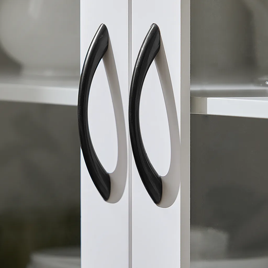 Dieser elegante Aufbewahrungsschrank ist exquisit mit einer eleganten weißen Oberfläche und zwei Glastüren gestaltet.