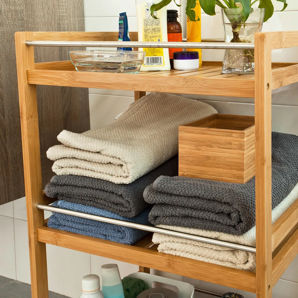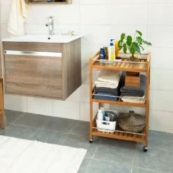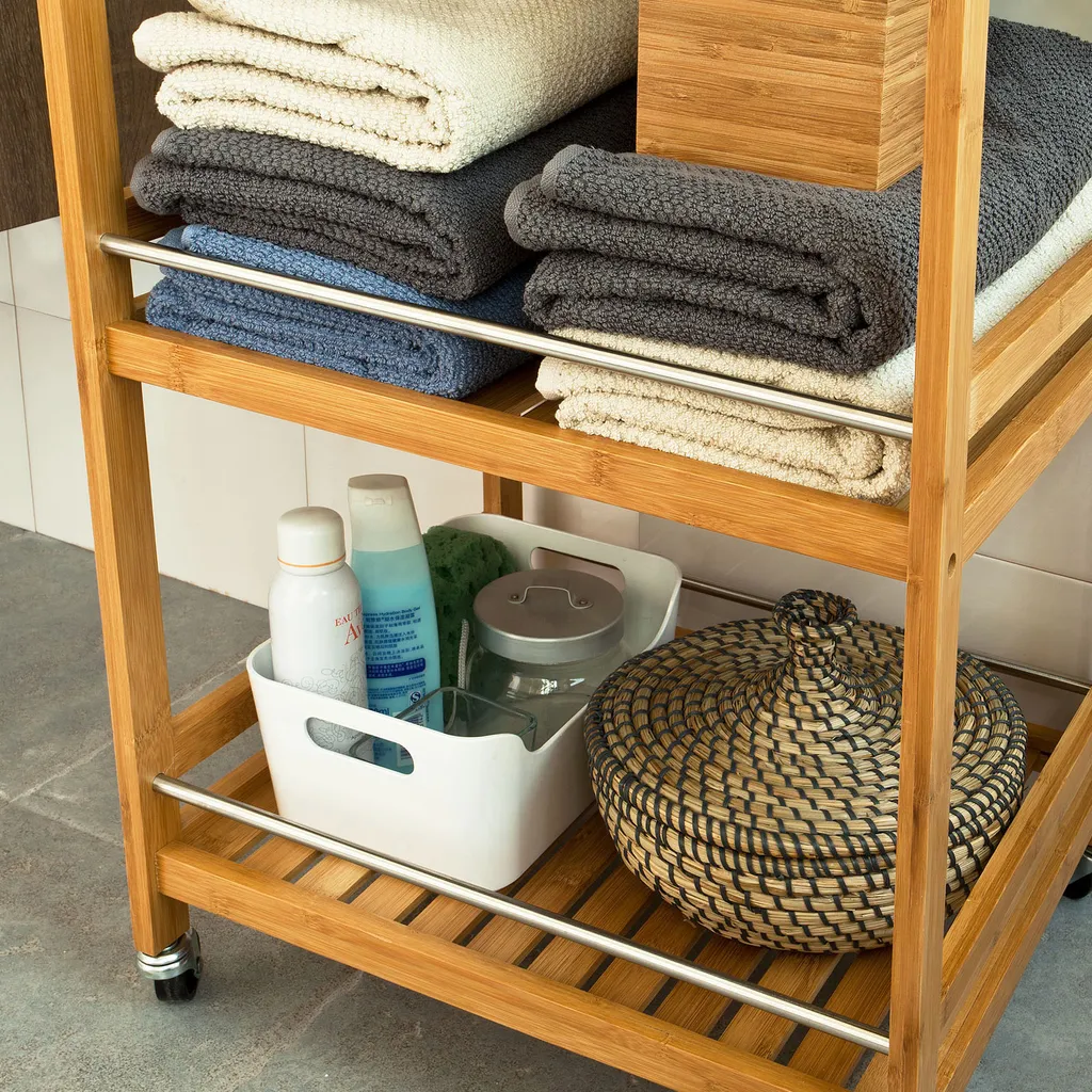 Dieser Küchenwagen aus Bambusholz ist stabil und bietet sehr viel Stauraum für verschiedenste Utensilien in Ihrer Küche oder Ihrem Badezimmer.