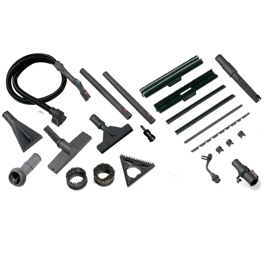 Dampfsauger Vapor 9000 A, Schlauch, Handgriff mit 2 Steuerungsmöglichkeiten, 2 Verlängerungsrohre, Polsterdüse, Mehrzweckbürste, Einsatz für Böden (Mehrzweckdüse), Einsatz für Teppiche (Mehrzweckdüse), Einsatz mit Gummileiste (Mehrzweckbürste), Fensterwischer, Zerstäuber, Fugendüse, Punktstrahldüse, 3 halbrunde Bürstchen für Fugendüse, 1 kleines Bürstchen für Punktstrahldüse, Verbindungsstück, Bürste mit rundem weichen dreieckigem Einsatz, Schalldämpfer, Satz O-Ringe