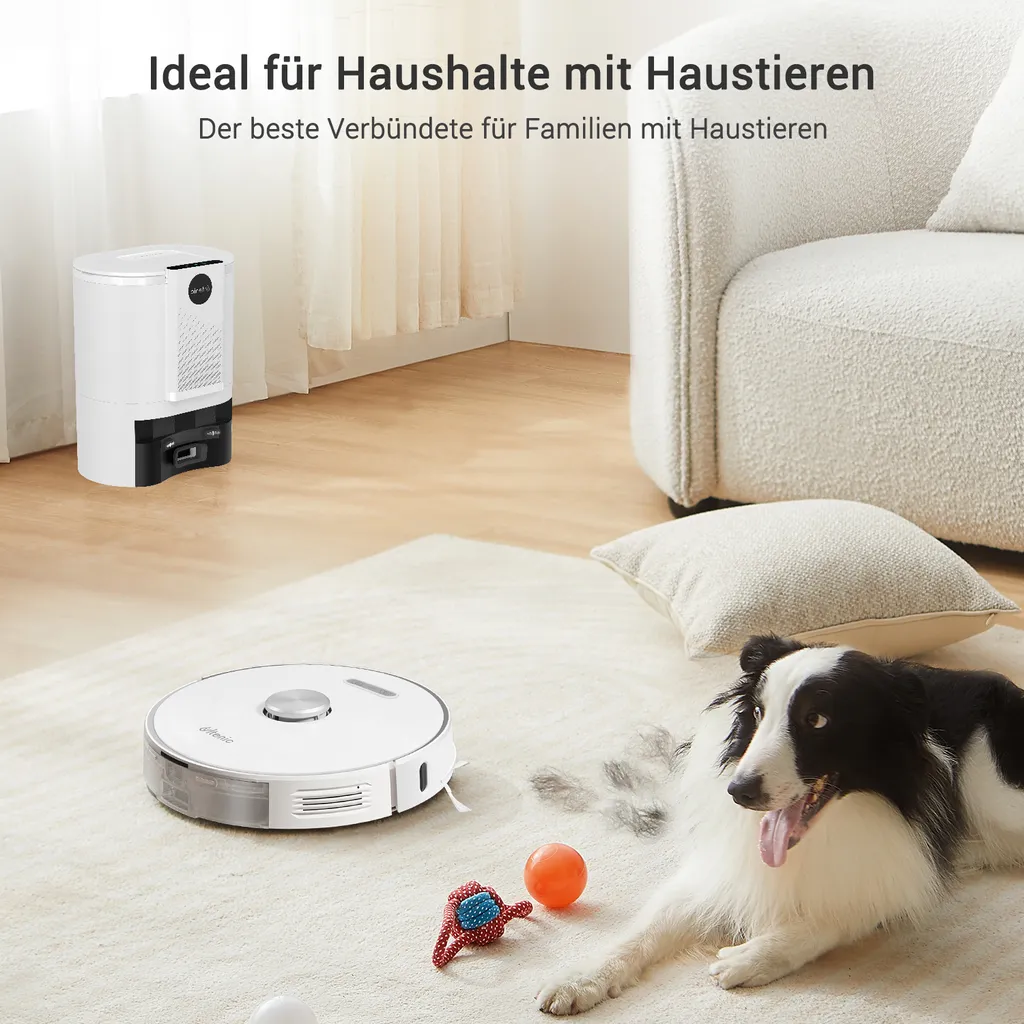 Druckbeaufschlagung des Teppichs:Saugroboter mit Absaugstation Die Saugkraft wird auf Teppichen automatisch um das Doppelte erhöht,um einen besseren Reinigungseffekt zu erzielen