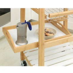 Bambus ist ein Naturmaterial, das sehr schnell nachwächst und sehr beliebt ist. Dieser universelle Rollwagen überzeugt durch seine vielseitigen Einsatzmöglichkeiten und seine Gestaltung in weißen MDF-Platten. Dies ist durch seine große Ablagefläche, einer Schublade, einem herausnehmbaren Drahtkorb und einem abnehmbaren Tablett sichergestellt. Dieser Rollwagen ist praktisch und sehr vielseitig, um Speisen und Getränke bequem an einen gewünschten Platz zu bringen. Ob in Ihrer Küche, im Ess- oder Wohnzimmer oder auf der Terrasse und Balkon. Auf ihm können Sie leicht und einfach Speisen und Getränke anbieten: Frühstück , Buffets für die Party am Abend und zum Grillfest. Oder Sie platzieren den Servierwagen fest an einem Ort.