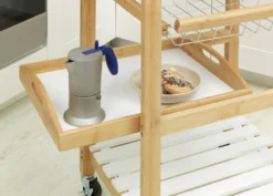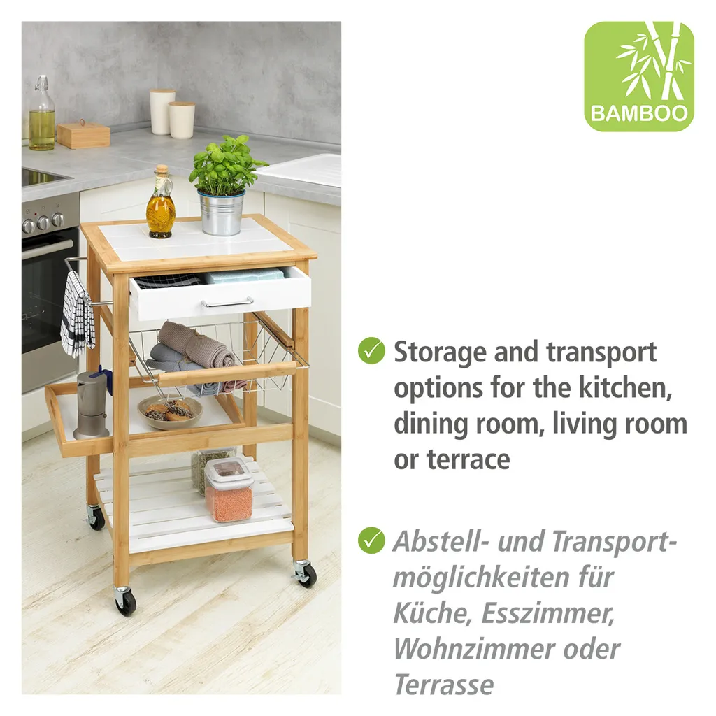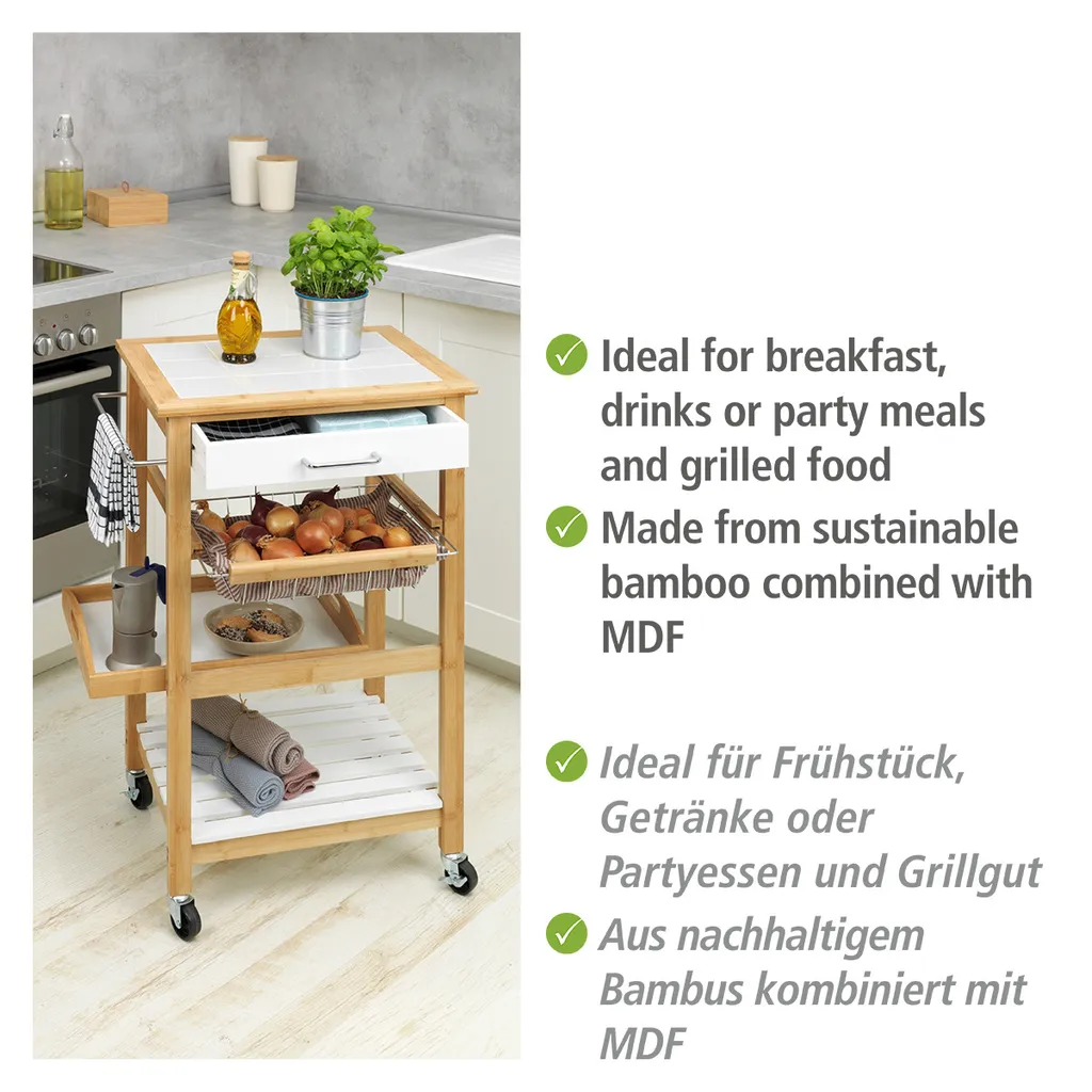 Der Küchenwagen auf Rädern FINJA von WENKO zeichnet sich durch drei Regale, eine Schublade und einen Textilaufhänger aus. Der Wagen war mit Rädern ausgestattet, die ein freies Gleiten ermöglichen. Das Accessoire wurde aus Bambusholz hergestellt und würde daher viele Jahre lang dienen.
